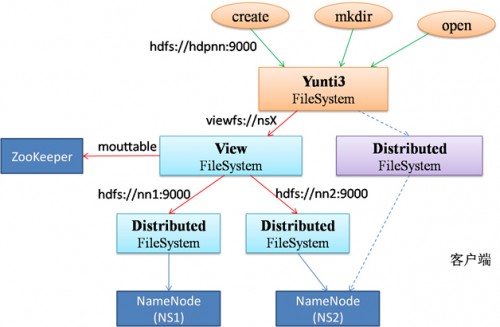 经过客户端的改造和升级,以前老的访问方式由智能的Client接管。由Yunti3FileSystem根据访问路径自动选择要访问的NameNode,实现了数据的分切对客户端透明。也由此解决了前述难点6(怎样做到对用户透明)。