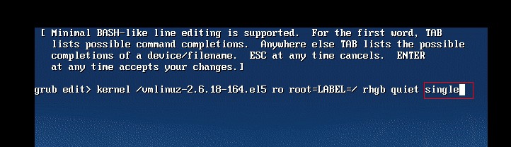 5. 在本行最后添加一个空格,然后输入single,告诉LInux内核下一步是要进入单用户模式,单击Enter:
