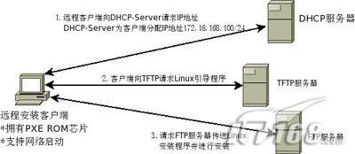 因此准备建立远程安装服务器至少需要三个服务:DHCP、TFTP、FTP,三个服务可以再三台不同的计算机上,也可以在同一台计算机上进行实现。