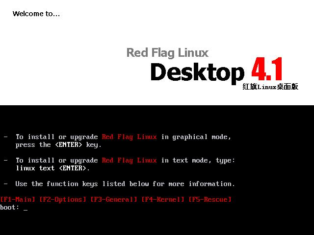 整个过程在256+40G+1.7G用时40分钟 首次做图解文章,没有经验,如果有什么地方不对,请大家多多指正。 关于红旗Linux,我不想多说什么,应该说他是民族产业的里的一颗明珠。 为了支持下国产软件,尽管他没有RedHat那么多的用户,我们是不是还要给他加加油捏?呵呵,闲话少说,进入正题 Red Flag Linux大家可以在http://www.redflag-linux.com/xiazai/index.php这个地方下载到所有的版本(我这里用的是红旗Linux桌面4.1版RC1-第一张盘(系统安装盘))下载过来的不ISO文件。做成光盘,用光盘来引导系统,如果在安装之前对于自己的硬件不放心的可以到http://www.redflag-linux.com/ppd/product_user/hardware_table.php?ihvid=&typeid=这里看下,所有的软件硬件兼容列表都有。 其实在安装过程中你会感觉这和Windows没什么区别的。用光盘直接引导,他就出现如下图所示的安装介面