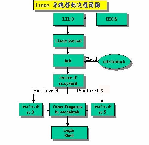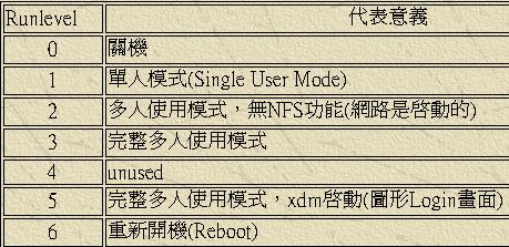 RunLevel因应不同需求,Linux(UNIX)可以分为七种不同激活模式,或七种不同执行等级,一般正常使用的系统多开启为Level 3 或5.Run Level的改变root可以使用init或telinit切换到不同Run。 Levelinit 0 = shutdown -h init 6 = reboot。