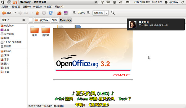 后面这个是文件管理器,恰好打开一个文档(下图),而也恰好赶上音乐播放器切换歌曲,右上角的提示就是歌曲专辑的封面、歌手信息等,下面的是歌词。