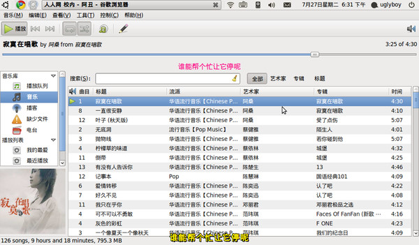 这是刚刚提到的音乐播放器,功能比较全,支持iPod,支持自动下载歌词,桌面显示等。ps:这几张图下面显示的歌词其实串起来就能知道我截图的时候正在听什么歌了,大家竞猜一下?