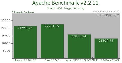 首先是由Apache开始测试,从测试数据结果可以看到,领先的是CentOS 5.5,每秒执行的事务比RHEL 6.0 Beta 2领先将近70%。而Ubuntu 10.04 LTS也以不错的表现。在这个测试中RHEL 6.0 Beta 2相比OpenSUSE 11.3 RC2略落后,CentOS领先的原因可能是它默认使用的EXT3文件系统有关,其它三个都使用了EXT4文件系统。