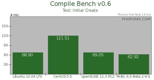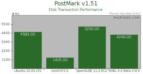 但在测试软件中,可能是EXT3文件系统更加适合表现,CentOS 5.5在这一轮测试中以绝对优势领先于其它三个发行版,由于只有这款系统平台使用EXT3。Ubuntu 10.04 LTS和OpenSUSE 11.3 RC2的成绩相差不大,而RHEL 6.0 Beta 2在这次测试中表现依然不如意。