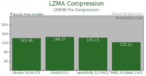 尽管之前的3项测试没有很好表现,但RHEL 6.0 Beta 2在LZMA压缩测试中明显有着优势,测试使用LZMA压缩一个256MB大小的文件,RHEL 6.0 Beta 2的压缩速度明显快于OpenSUSE,Ubuntu和CentOS,它们三个系统的压缩时间基本相当。