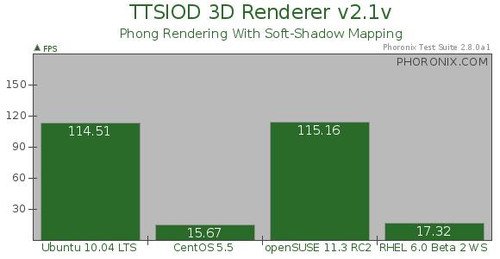 对于TTSIOD 3D渲染是一个软阴影映射样式渲染基准测试,它测试中仅利用了CPU,没有使用GPU。在这一轮测试中,Ubuntu 10.04 LTS和OpenSUSE 11.3 RC2以较大优势领先,而CentOS 5.5和RHEL 6.0 Beta 2则相差较大。