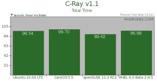 相比之前一系列测试,在这一轮测试中,各个系统平台表现似乎差距并不明显,尽管OpenSUSE 11.3 RC2在C-Ray测试中胜出,但Ubuntu 10.04 LTS和CentOS 5.5以及RHEL 6.0 Beta 2的表现则非常接近。