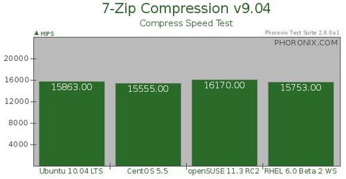 同样情况出现在7-Zip压缩测试中,参与测试的四个发行版没有太大的差距,尽管OpenSUSE 11.3 RC2略微优势胜出,但整体来看这几款系统平台表现都较好。