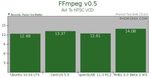 在FFmpeg视频编码测试中,Ubuntu 10.04 LTS以微弱优势胜出,它高出第二名OpenSUSE 11.3 RC2仅0.13秒,CentOS和RHEL 6.0 Beta 2相比前两款平台的测试结果差距也不大。