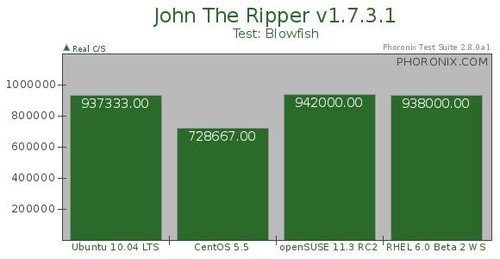 在John The Ripper的Blowfish加密性能测试中,Ubuntu 10.04 LTS,OpenSUSE 11.3 RC2和RHEL 6.0 Beta 2的测试结果非常接近,体现新一版RHEL 6.0在应用安全方面的加强。