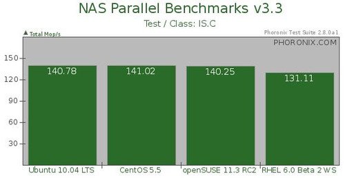 在NASA NAS并行基准IS.C测试中,Ubuntu 10.04 LTS,CentsOS 5.5和OpenSuSE 11.3 RC2的测试结果非常接近,而RHEL 6.0 Beta 2则在数据上再次落后。