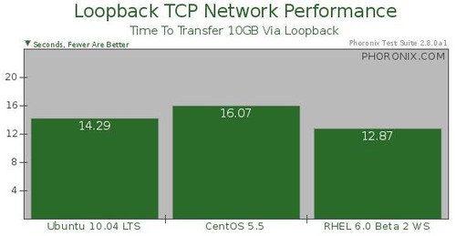 TCP环回网络性能测试在OpenSUSE上不能工作,RHEL 6.0 Beta 2这一次胜出,但Ubuntu 10.04 LTS和OpenSUSE 11.3 RC2的测试结果并非出现大的差距。