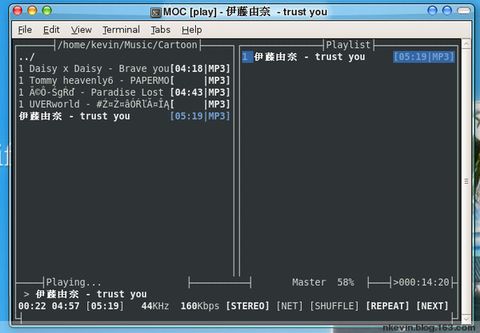 安装完成后在终端自下输入:“mocp”打开moc,很简洁吧。
