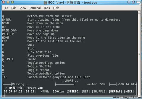 MOC是运行在“终端”下的音乐播放器,支持MP3,wma等格式。安装起来倒是很简单,至于使用,基本就是靠“字母快捷键”搞定的.在Ubuntu终端下输入