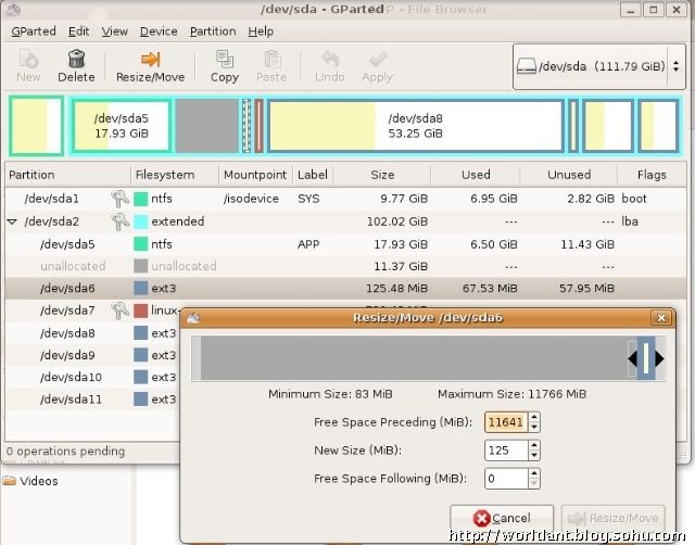 对于/dev/sda6,选中后,点击按钮“Resize/Move”,出现图2中的对话框,有三个编辑框,分别是:Free Space Preceding, New Size, Free Space following.我们要做的是调整第一个和第三个值。在图1和图2中,可以看到,"unallocated"大小为11.37GB(11641MB),它在/dev/sda6的紧上方,而/dev/sda6后面没有其他的空闲区了,所以,在“Resize/Move”对话框中,Free Space Preceding为11641MB,而Free Space following为0MB。