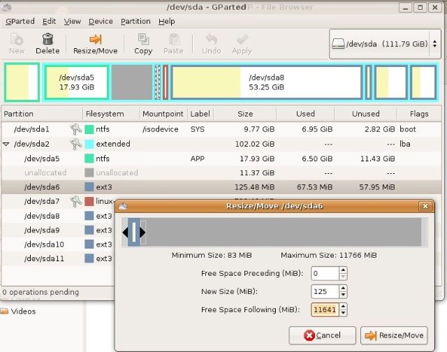 这样,一步步,一次对 /dev/sda7, /dev/sda8做同样的处理,就可以把空闲区挪到/dev/sda9的紧上方。再对/dev/sda9进行“Resize/Move”,就会发现,该分区的前后空闲区的大小已经不是都为0了,它的前面空闲区已经是11641MB了,这样,就可以对/dev/sda9进行扩容了。