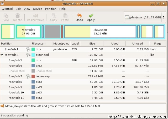 为了把空闲区往下挪,挪到/dev/sda6的紧下面(离/dev/sda9更近),只要把/dev/sda6的Free Space Preceding设为0,而Free Space following设为空闲区的大小。当然,如果不是要把整个空闲都挪动,这个值可以设定为你需要的小些的值。如果需要整个挪动,有个技巧,就是只把Free Space Preceding设为0即可,系统会自动把Free Space following设置为需要的值(整个空闲区的大小),当然要实时看到结果,只要鼠标重新定位一下即可(在别的地方点一下,比如在Free Space following的输入框)。设置的情况,见图3。然后点击对话框中的“Resize/Move”按钮,就可以看到图4的效果了。再点“Apply”,就开始了分区位置调整的处理,实现图4的设置。(当然,可以把所有的操作和最终的效果设置好,再apply)