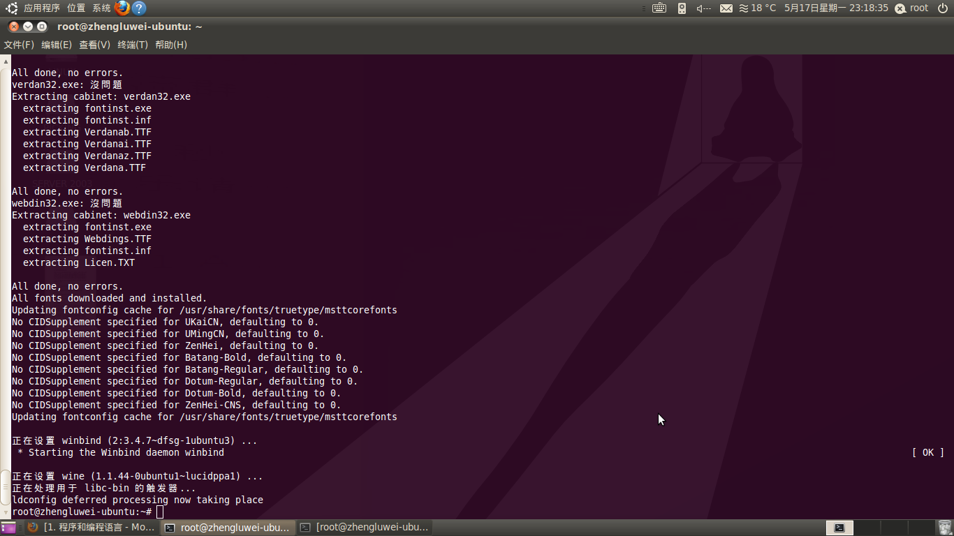 但是使用的是:sudo apt-get install wine,下载自动配置后,20几兆的,大约五六分钟吧,安装完毕。