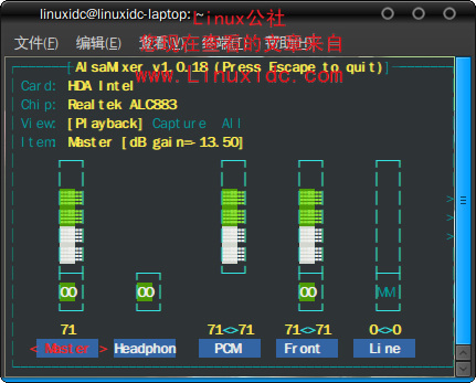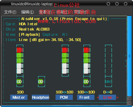 打开Ubuntu的终端,输入命令:alsamixer (见图1)