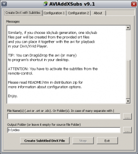 这里使用的是软件叫 AVIAddXSubs。目前的 9.1 版本只有 896K,十分小巧。尽管该软件是一款 Win32 下的软件,但是作者在页面上注明了 Linux 和 Intel Mac OS X 系统的用户可以使用 WINE 或者 Crossover 软件运行。