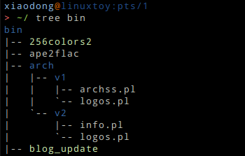 Tree 这个小工具可以让你在 Linux 下列出树形的目录和文件。它支持递归目录,并能够产生色彩化的输出。在我的系统上执行 tree bin 后的效果如下图所示。