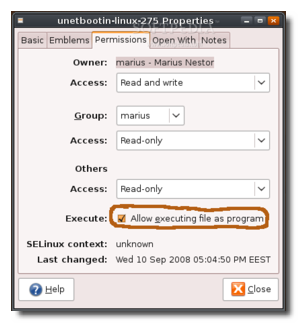点击“权限(Permissions)”选项,选中“允许执行(Allow executing file as program)”前的选项卡,如图2.