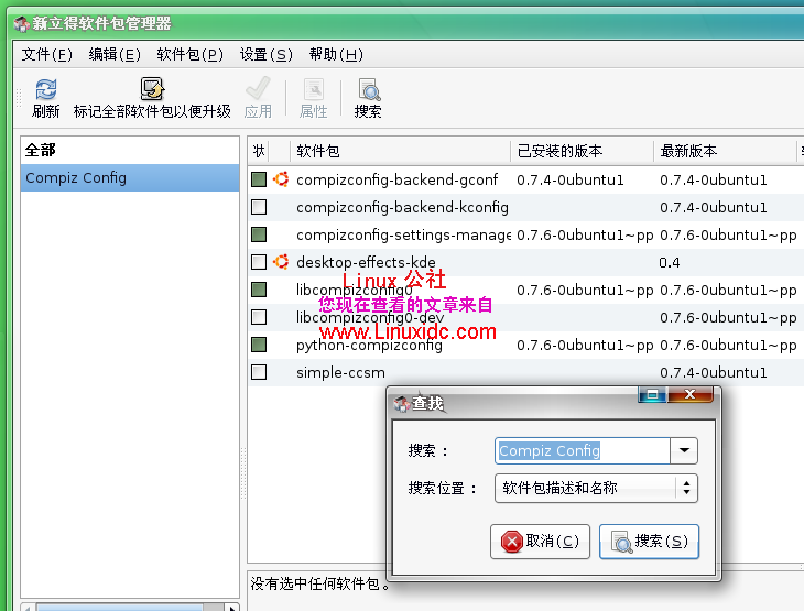 先看一个Ubuntu 8.04下的桌面特效,漂亮吧。关于在Ubuntu 8.04下Compiz Fusion的设置方法Linux公社已经介绍过多次了,你可以利用本站的搜索,查找下有关文章。Ubuntu 8.04 ( Hardy Heron ) 是完全支持 Compiz Fusion所有特性的一个Linux版本。但是主要的问题是没办法来配置这些特性,为了配置这些不同的选项,我们需要使用一个叫 Compiz Config的工具软件。点击——系统——系统管理——打开新立得软件包管理器(图2),搜索 Compiz Config 然后安装就可以了(图3)。