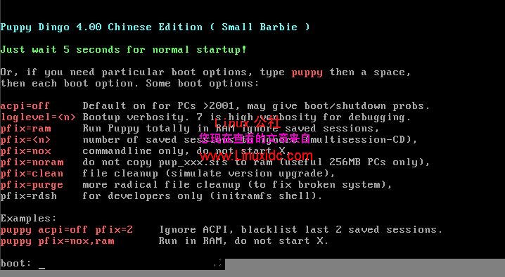 启动Puppy后,会提示你选择初始配置:先选择键盘US。再选择 X server。 Puppy自带了两种 X server: Xorg和Xvesa。建议先选择"Xorg",如果“Xorg”测试通不过的话,再选择"Xvesa"(分辨率较低,但保证能进入图形界面)。