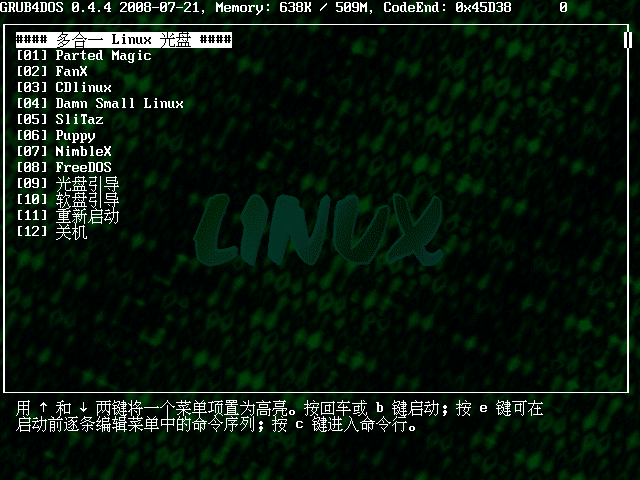 搜集了几个小型的 Linux 的 LiveCD,本来就 600 多 m 的就不会考虑了。找些麻雀虽小,五脏俱全的,找到 7 个比较新的,中文支持最好,最好软件也不要重复。引导器自然首选是 Grub4DOS 啦,花些心思给每个发行版都弄了启动背景。