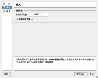 这样Linux,Windows两不误,大家都玩玩Ubuntu吧!最后还有一点注意的是,有的时候会突然发现VM里键盘不能用了,在VirtualBox主控台的"文件"->"偏好設定"->"输入",取消"自动捕捉键盘",就可以让keyboard恢复正常了。