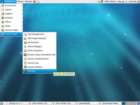 Before we install VMware Server, we must install some prerequisites. To install them, open a terminal (Applications > System Tools > Terminal):
