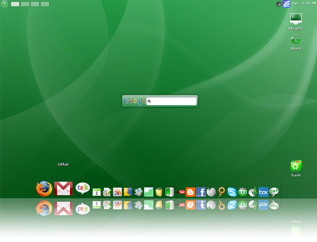 gOS操作系统,大家现在应该都知道这不是官方的google os, 但既然带个g就肯定跟google脱不了干系,全名greenOS是基本于Ubuntu的一个linux发行版,内置了包括Google Docs, Google Maps, YouTube, Gmail,Skype, Facebook, Wikipedia等在内的多种web应用,而且界面也相当清新。