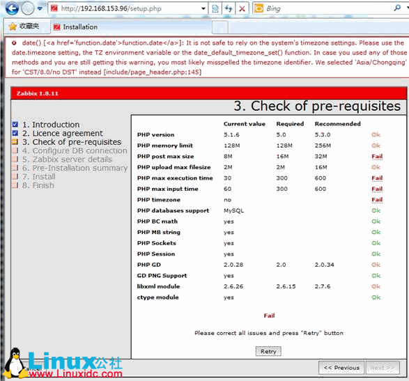 Licensce Agreement选择I agree并next后,进入配置检查页面,会发现 PHPpost max size、PHP max execution time、PHP max input time、PHP timezone项检查失败,如下: