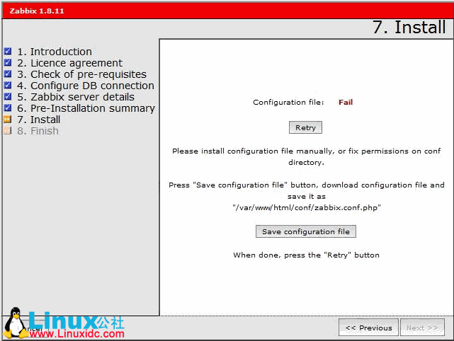 点击 save configuration file,然后将文件上传到虚拟机的 /var/www/html/conf目录下,点击 retry,成功。一路 next,进入登陆页面。