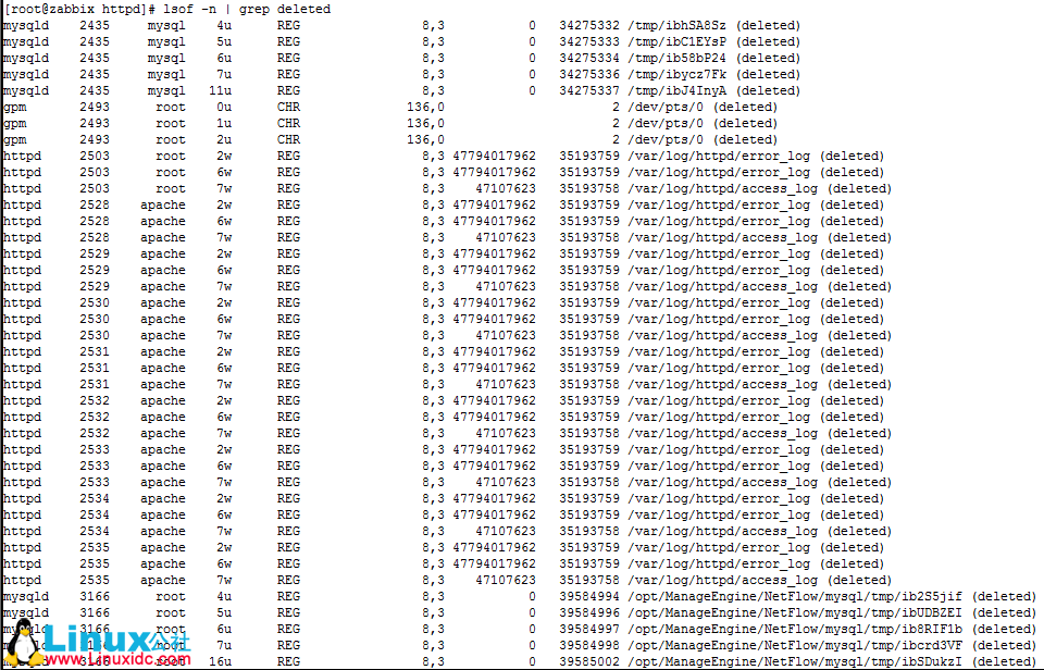 删除了/var/log/httpd内的文件后,用df -ha看到的结果却和之前仍然一样,磁盘空间未被释放。应该是未在硬盘上正式删除,因为httpd和mysqld服务没有stop,所以这两个进程,应该还在用这些文件嘛,用 lsof -n | grep deleted命令查看,果然!!!如下图: