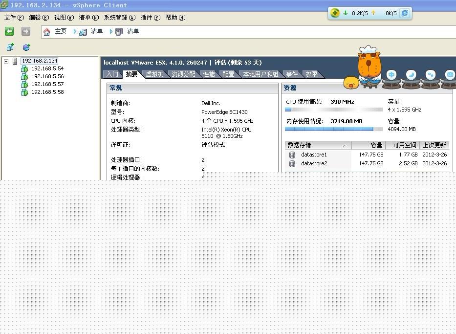 安装过程很简单,我也不想说了,网上一抓一大把,谈一下安装时候出现的小问题,我们测试机上2块160G的硬盘,本来机器上有个ESX4.0的系统了,我安装了3边没搞定,一开机总是显示老的ESX4.0,而不是ESX4.1,安装时会提示往哪块硬盘装,这个看好是哪一个是引导的硬盘,在那个引导的硬盘上装。还有就是在装完ESX,要装linux系统时要规划好硬盘,虚拟内存等。客户端工具vSphere可以对虚拟机进行管理很爽啊,有兴趣的可以试一下!