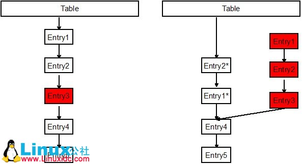 remove操作,如下图,要删除Entry3,则先复制Entry1为Entry1*,Entry1*指向Entry4,再复制Entry2为Entry2*,Entry2*指向Entry1*,最终形成一个两叉的链表。原本的Entry1,Entry2,Entry3会被GC自动回收。