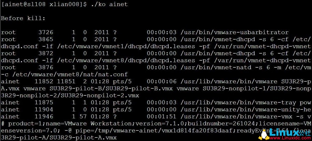 一个典型的应用就是:两三个人共享一台设备Linux Server,然后使用VMware安装自己的调试运行环境,大家共用一个用户名(一般不是root)登陆。由于硬件设备性能瓶颈所限,同一时刻只能有一个虚拟机在运行(理论上可以同时跑多个虚拟机,但是速度慢,性能跟不上,无法实际应用)。当前用户登陆使用该硬件设备时,需要杀掉别的同事遗留的进程(理论上应该进程的启动者来清理,但可能常常被忘记,类似于上了厕所忘了冲水),这时候当前用户就需要用命令“ps -ef|grep vmware”查看遗留的进程号,然后用命令“kill -9 processid”一个个来杀掉。经常这么做,很繁琐费事,于是自己写了一个tool,测试了一下,很好用,特地分享一下。