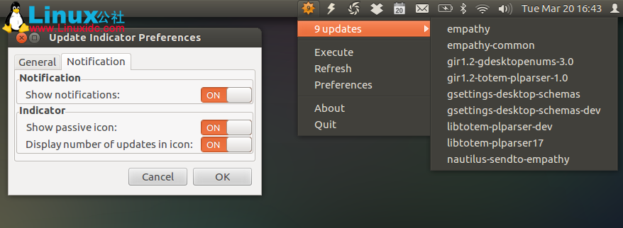 update manager indicator是一个Ubuntu appindicator显示面板上显示当前有可用更新,并带有一些额外的功能,如显示子菜单中的更新列表,刷新库或显示NotifyOSD通知,当您有新的更新的时候。