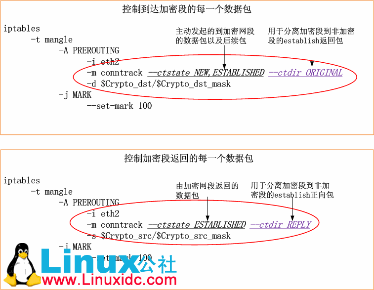 有了一个基本的认识,再遇到问题的时候就可以用知道的知识来解决了,比如《iptables和策略路由实现VPN感兴趣流的截获》一文中的问题,要截获一个特定的流,然而由于拓扑复杂,还要支持任意点到任意点的互通,仅仅根据IP层的信息就很难分辨出一个双向的数据流是由哪里发起的,因此就必然要使用ip_conntrack。ip_conntrack有一个match,那就是ctdir,它可以分辨出方向信息,然而它是如何做到的呢?通过上图就可以看出,ip_conntrack保存了一个哈希表,其中的表项内容就是一个五元组,然而两个方向的五元组信息是分开存放的,这就便于根据单独的五元组进行查找,虽然它们分开存放,属于同一个流的双向两个五元组又由同一个nf_conn结构(不同内核版本名字可能不同)统一了起来。如此一来就很容易辨别方向了。流量截获的mangle规则如下图所示: