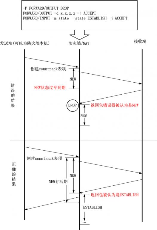 尽量不要减小NEW状态时间,因为对于某些恶劣的网络,一个数据包的来回确实需要很长时间,对于TCP而言,此时RTT还没有测量呢。如果NEW状态的conntrack保留时间过短,就会导致大量NEW状态的连接,而对于很多依赖ctstate的模块而言,这样就会有问题,比如iptables的filter表中使用ESTABLISH状态来放过前向包的返回包就会有问题,此时ip_conntrack很有可能由于NEW状态时间过短而将返回包作为NEW状态处理而不是ESTABLISH状态,如此一来,返回包就无法通过了。如下图所示: