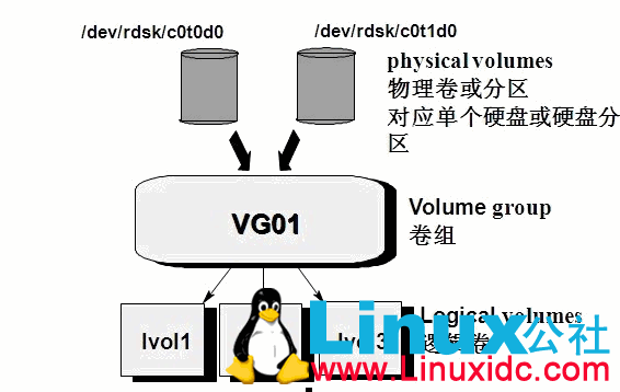 VG(volume group):卷组建立在物理卷上,一卷组中至少要包括一物理卷,卷组建立后可动态的添加卷到卷组中,一个逻辑卷管理系统工程中可有多个卷组。