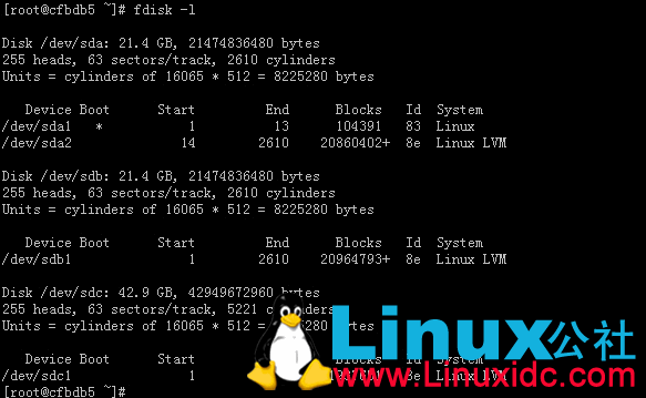 1.准备物理分区(Physical Partions) 首先,我们需要选择用于 LVM 的物理存储器。这些通常是标准分区,但也可以是已创建的 Linux Software RAID 卷。这里我利用fdisk命令,将sdb、sdc两块磁盘分了两个区sdb1、sdc1, 通过fdisk的t指令指定分区为8e类型(Linux LVM) 。如图2所示。