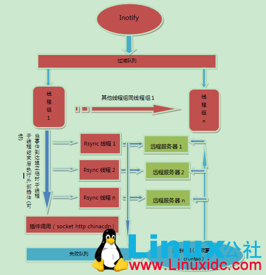 如上图所示,线程组线程是等待线程队列的守护线程,当队列中有数据的时候,线程组守护线程逐个唤醒,当队列中inotify事件交多的时候就会被全部唤醒一起工作。这样设计的目的是能够同时处理多个inotify事件,重发利用服务器的并发能力(核数*2+2)。