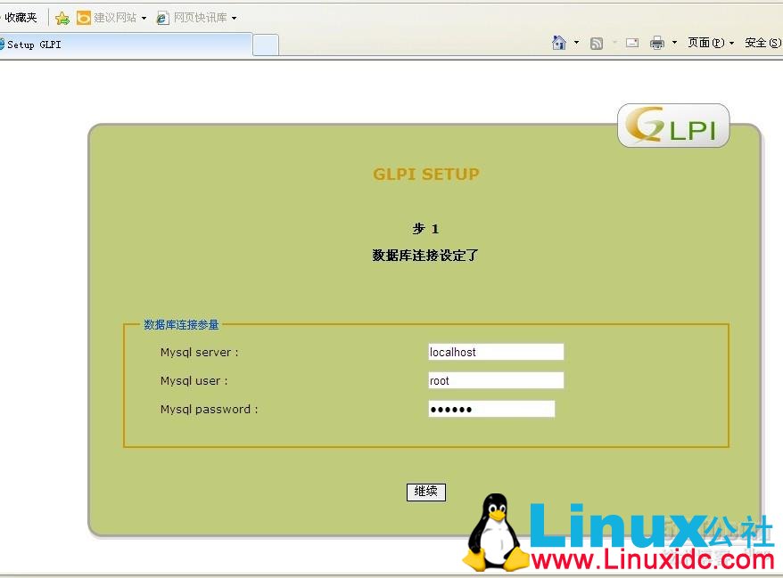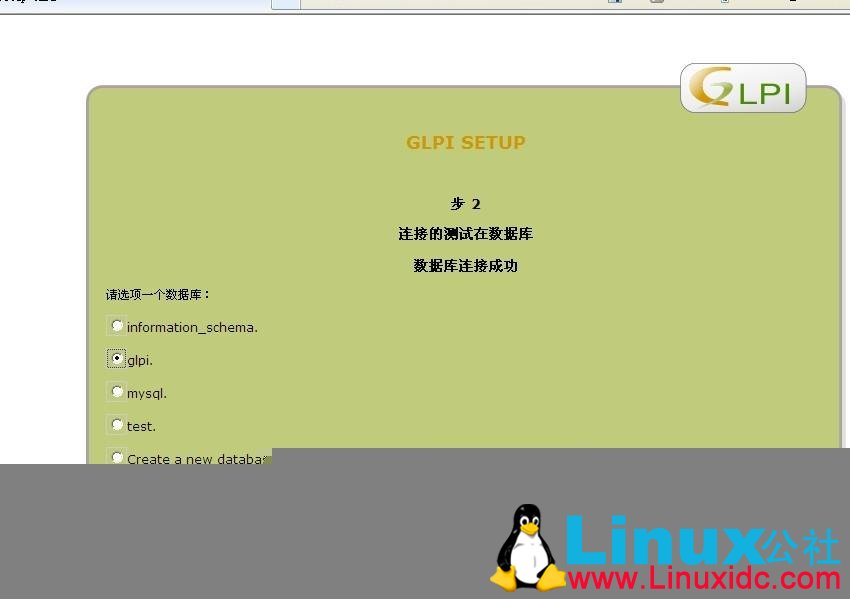 9.步骤2测试连接数据库,因为在脚本中已经创建了glpi,所以这里选择glpi,如果没有可以直接用web来创建一个。