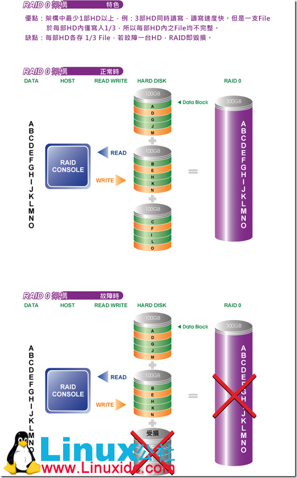 将多个磁盘合并成一个大的磁盘,不具有冗余,并行I/O,速度最快。RAID 0亦称为带区集。它是将多个磁盘并列起来,成为一个大磁盘。在存放数据时,其将数据按磁盘的个数来进行分段,然后同时将这些数据写进这些盘中。 所以,在所有的级别中,RAID 0的速度是最快的。但是RAID 0没有冗余功能,如果一个磁盘(物理)损坏,则所有的数据都会丢失。 理论上越多的磁盘性能就等于[单一磁盘性能]×[磁盘数],但实际上受限于总线I/O瓶颈及其它因素的影响,RAID 性能会随边际递减,也就是说,假设一个磁盘的性能是50MB/秒,两个磁盘的RAID 0性能约96MB/秒,三个磁盘的RAID 0也许是130MB/秒而不是150MB/秒。所以,两个磁盘的RAID 0最能明显感受到性能的提升。