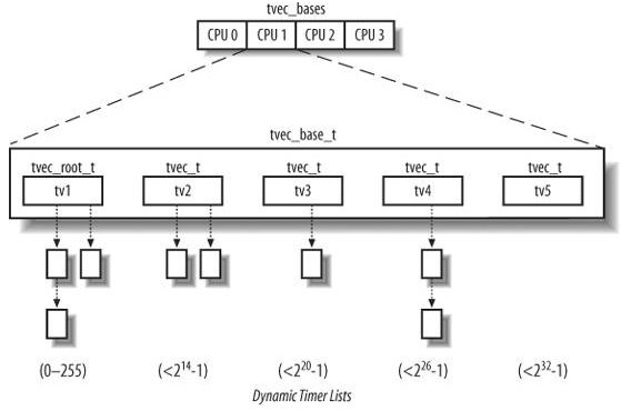 动态定时的主要数据结构是一个叫做tvec_bases的per cpu变量,他包含NR_CPUS个元素,系统中每个CPU都有一个。每个元素是一个tvec_base_t类型的数据结构,他包含相应CPU中处理动态定时器需要的所有数据。