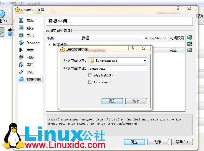 3. 设置-》数据空间-》固定分配,选择共享文件夹路径,注意此时不要勾选自动挂载,如下图所示。