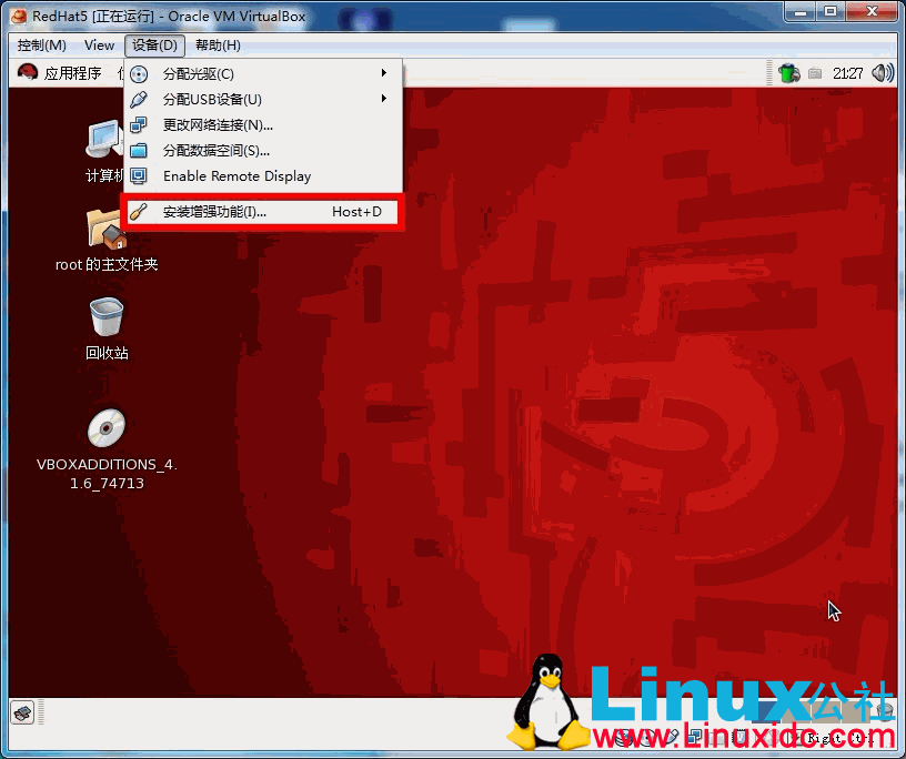 为了能让虚拟机自动调整显示尺寸以及使用数据空间与宿主系统进行文件共享,必须在RedHat中安装增强包,也就是VBOX Additions。
